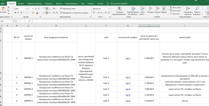 Так что если резюмировать Ваш основной инструмент при заказе газобетона это эксель. Кофе, компьютер. телефон в руки и вперед. Можно всегда найти супер вкусную и шикарную цену. НО ВАЖНО - никакой предоплаты. Ниже пример 20 минут времени потратил - надо было пробить цену на Могилевские блоки.