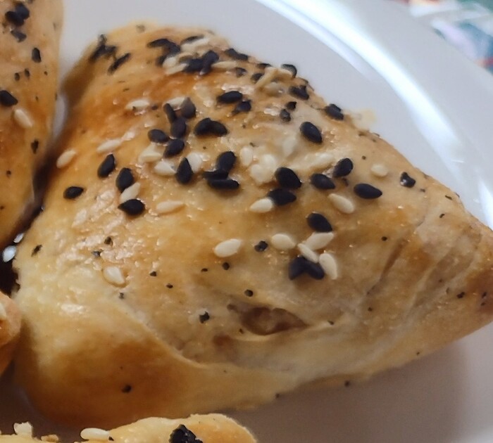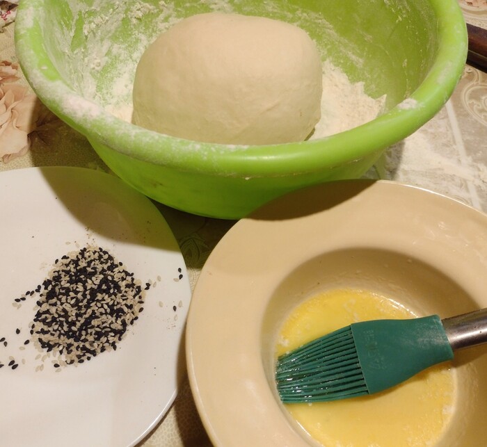 Далее - смазываю яйцом, посыпаю кунжутом и ставлю в предварительно разогретую духовку при 180 градусах на 35-40 минут.