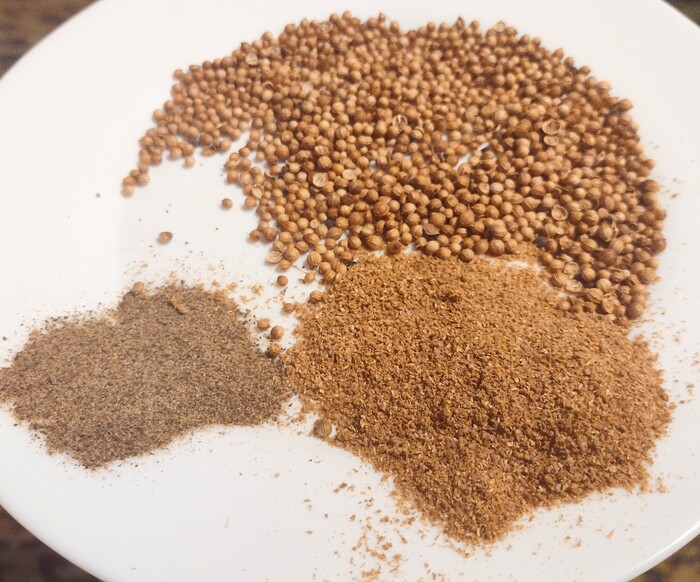 Специи: кориандр (кинза), кумин (зира) и чёрный молотый перец. Ну и соль.