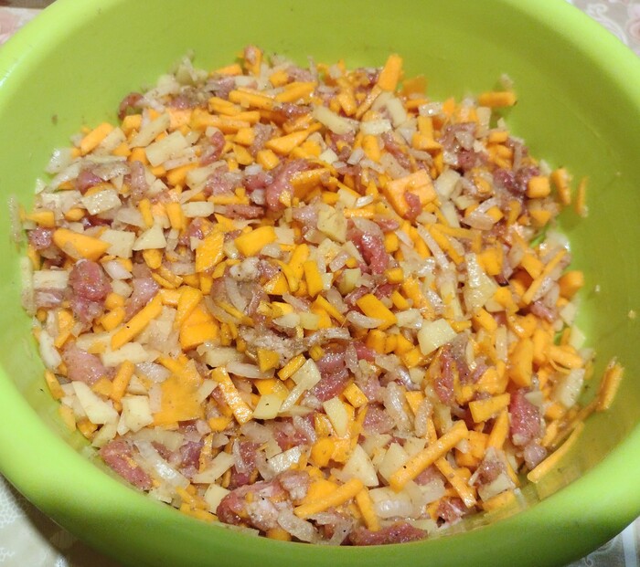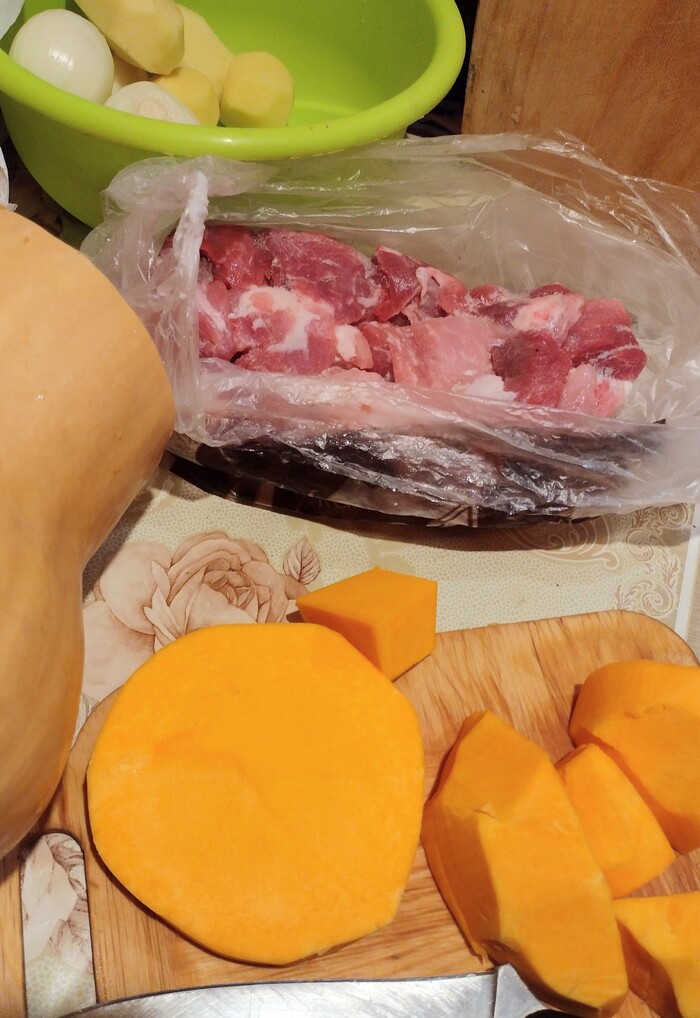 Начинка: мясо, лук, тыква, картошка. Всё нужно нарезать кубиками. Всё -таки, если готовить из фарша, вкус будет иной - "фаршевый". А мясо, нарезанное кусочками, даёт сочность, и при откусывании самсы, почувствуется насыщенный бульонный сок от начинки.
