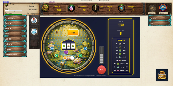 Из нового-решил сделать аналог игрового аппарата-Починко, совместив его со слот машиной. Получилось интересно и увлекательно. Игрок обменивает ресурс-ракушки на игровую фишку, использует ее и получает 20 шариков, зажимая кнопку регулирует силу пружины, которая шарики толкает, награда от 100 очков-1 кристалл, от 1000 очков -перо. Тут есть джекпот и комбо в слот машине и просто сектора призовые.