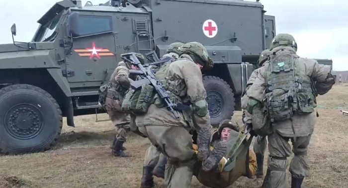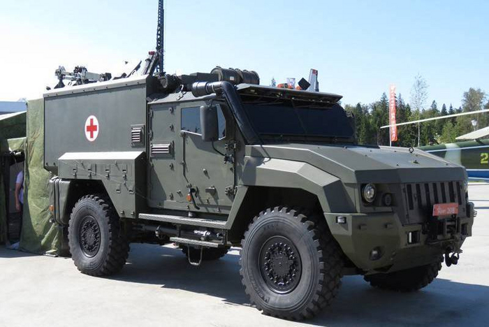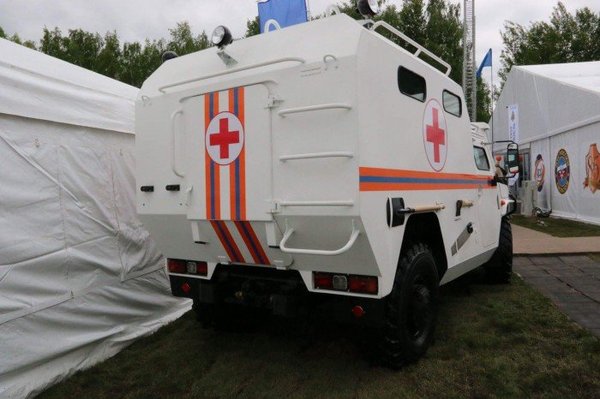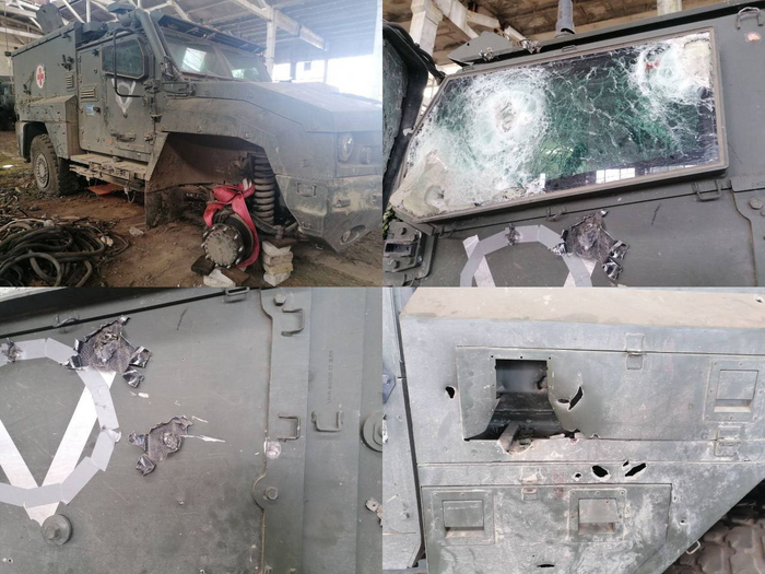 За ним даже сложно рассмотреть украинский санитарный автомобиль Богдан, которому судя по наглухо затонированным стёклам, сильно досталось.