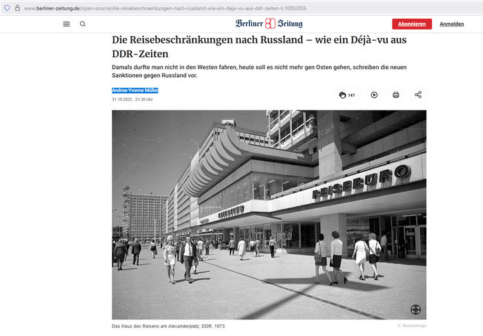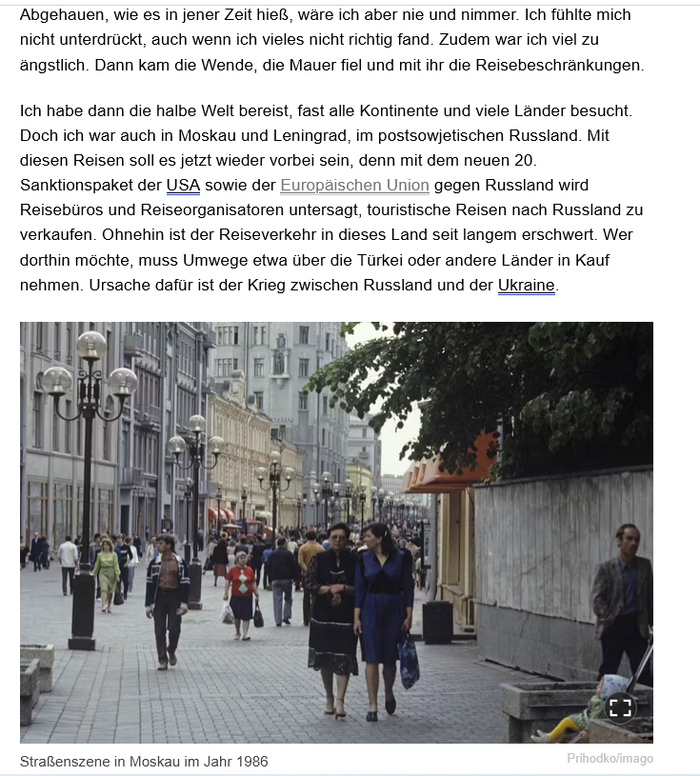 Затем я объездила полмира, побывала почти на всех континентах и во многих странах. Но я была также в Москве и Ленинграде, в постсоветской России. С этими поездками теперь, видимо, снова покончено, ведь новым, 20-м пакетом санкций США и Европейского союза против России турагентствам и туроператорам запрещено продавать туристические поездки в Россию.