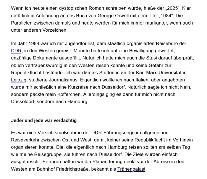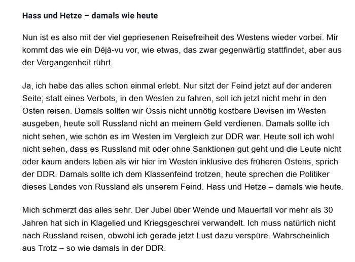 Да, я уже всё это уже однажды пережила. Только теперь враг сидит по другую сторону; вместо запрета на поездки на Запад, теперь мне не следует больше ездить на Восток. Тогда мы, «осси», не должны были тратить драгоценную валюту на Западе, теперь Россия не должна зарабатывать на моих деньгах. Тогда я не должна была видеть, как прекрасно на Западе по сравнению с ГДР. Теперь, видимо, я не должна видеть, что Россия с санкциями или без них живёт хорошо, и люди живут не или почти не иначе, чем мы здесь на Западе, включая бывший Восток, то есть ГДР. Тогда я должна была противостоять классовому врагу, теперь политики этой страны говорят о России как о нашем враге. Ненависть и подстрекательство — тогда и сейчас.