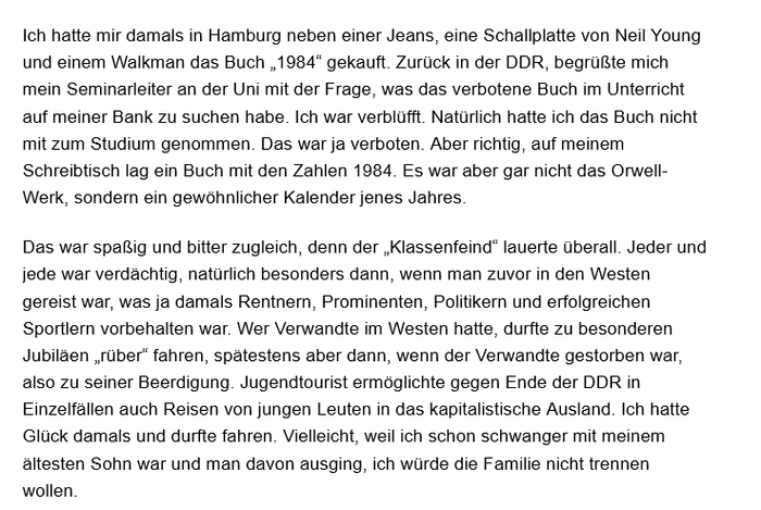 Тогда в Гамбурге я купила, помимо джинсов, пластинку Нила Янга и Walkman, книгу «1984». Вернувшись в ГДР, мой семинарский руководитель в университете встретил меня вопросом, что запрещенная книга делает на моей парте на занятии. Я была ошеломлена. Конечно, я не брала эту книгу с собой на учебу. Это ведь было запрещено. Но верно, на моем столе лежала книга с цифрами 1984. Однако это была вовсе не книга Оруэлла, а обычный календарь того года.