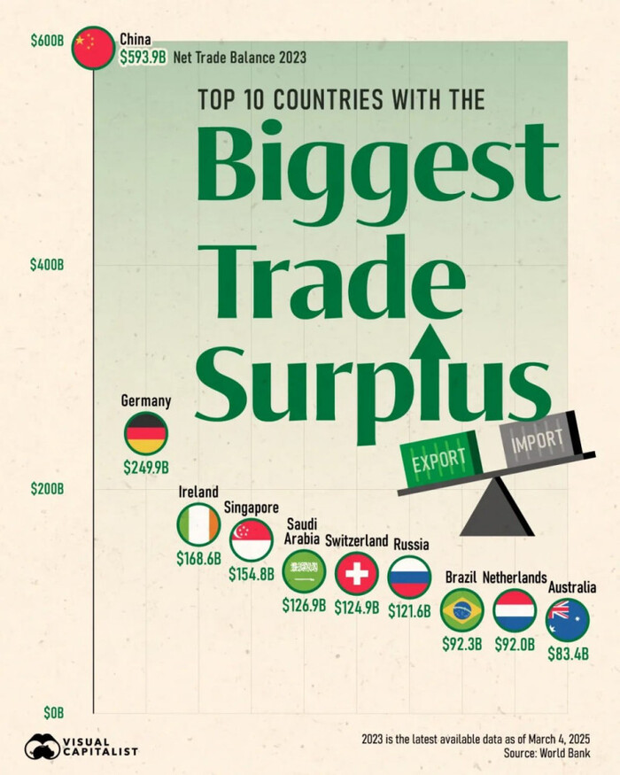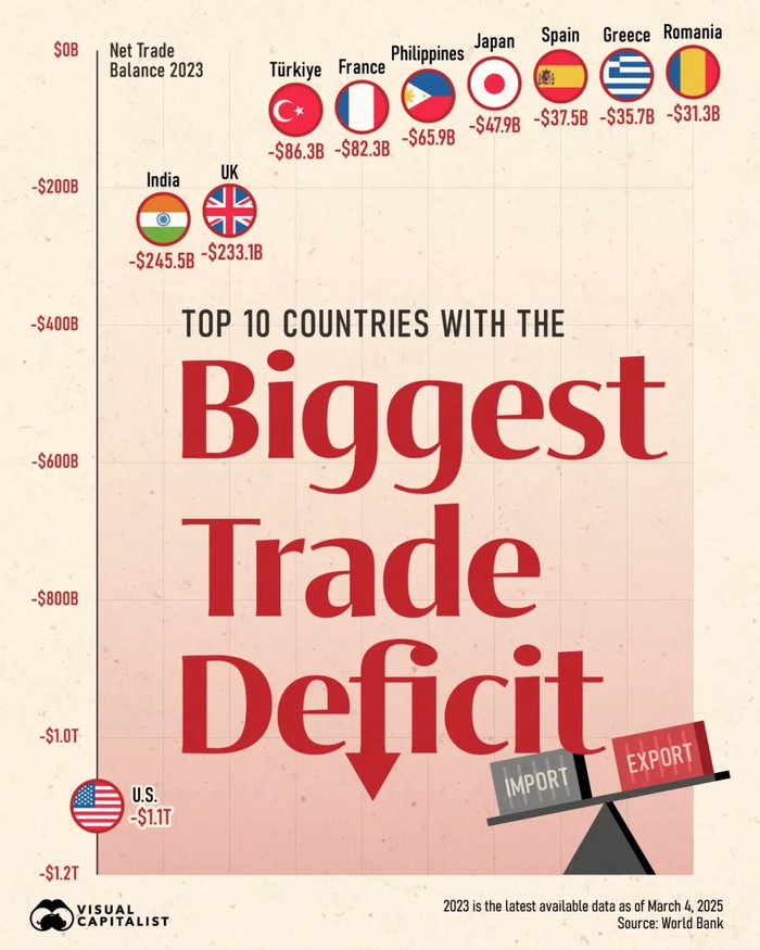 Крупнейший торговый дефицит по странам, на 2023. Россию видите? А США?