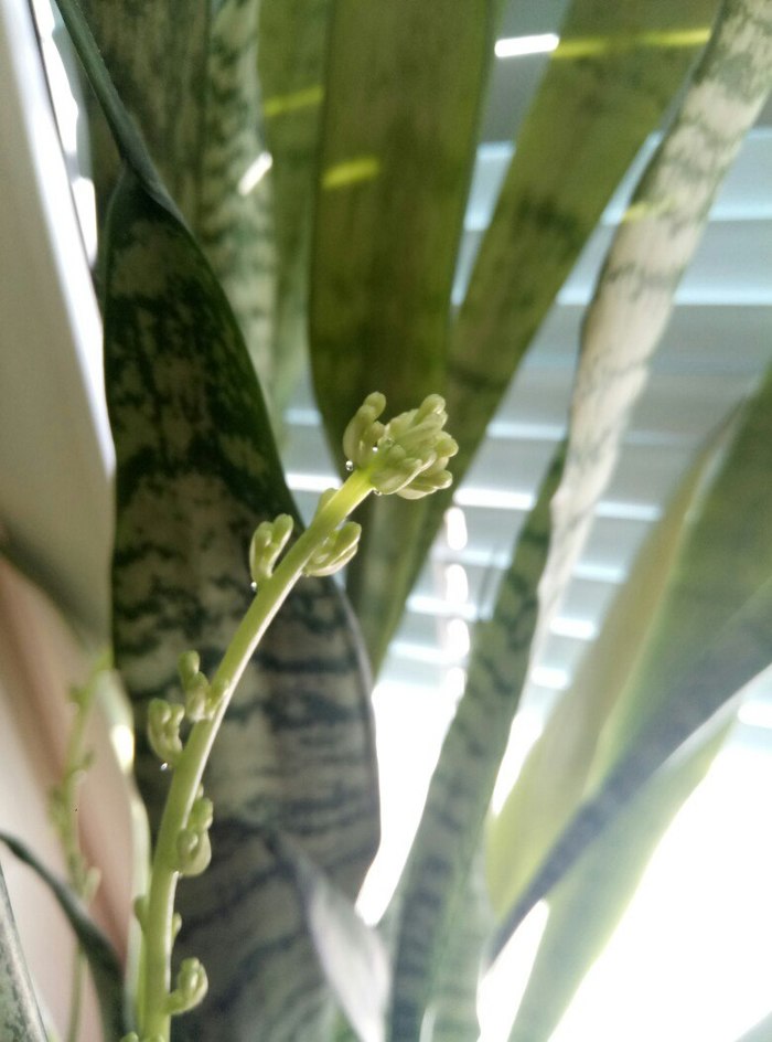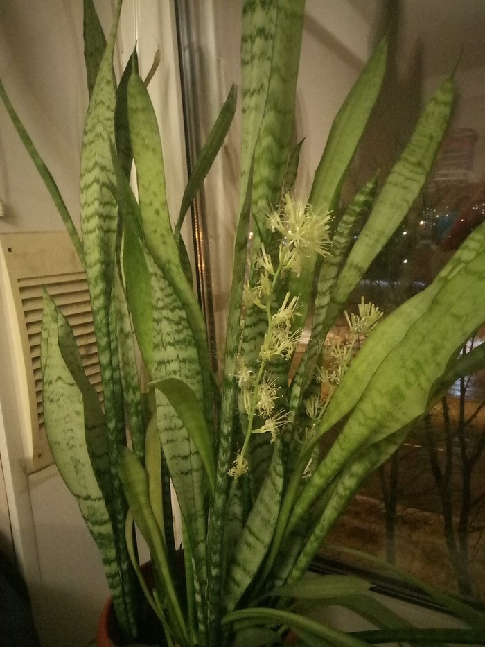 На моём окне случилось довольно редкое событие: зацвела сансевиерия трёхполосная, она же щучий хвост, она же тёщин язык, она же змеиное растение.
