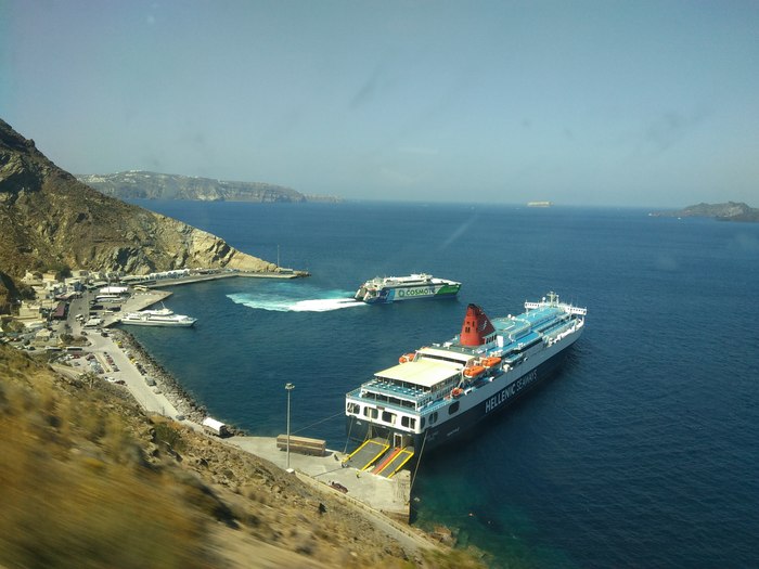 Размеры острова небольшие - примерно 20х5 км. Столица - город Фира (ударение на последний слог). Он находится на западном берегу на высоте 300 метров над уровнем моря. Недалеко от Фиры, если спуститься вниз по серпантину, расположен порт, где нас и высадил паром с Крита. Вот так выглядит кальдера и порт из окна автобуса при подъеме в столицу: