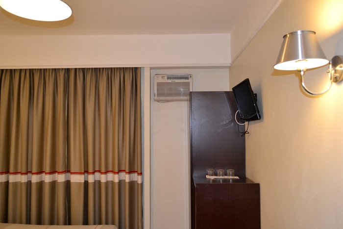 Располагался кондиционер высоко в углу, так что на кровати не дул и не капал.