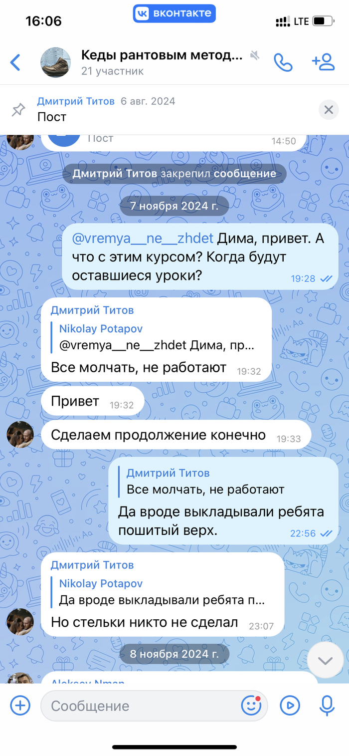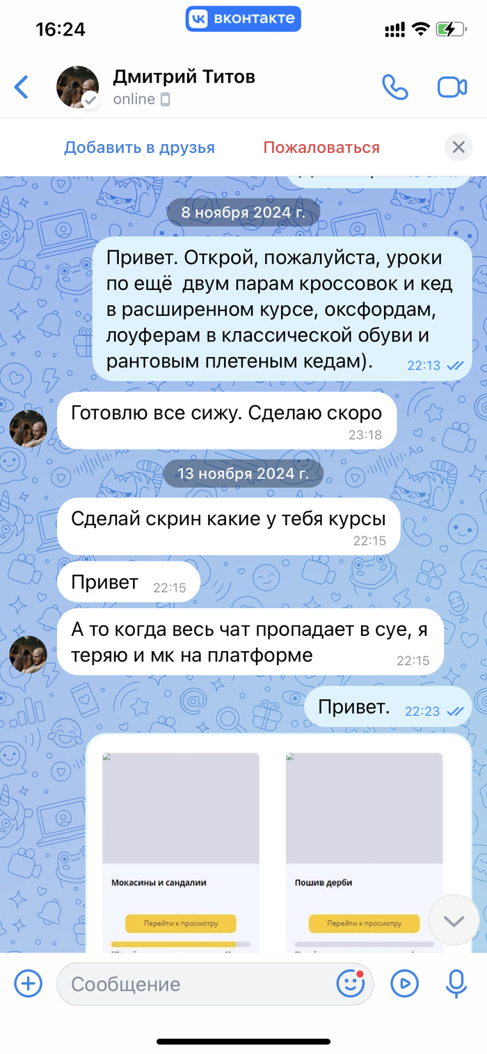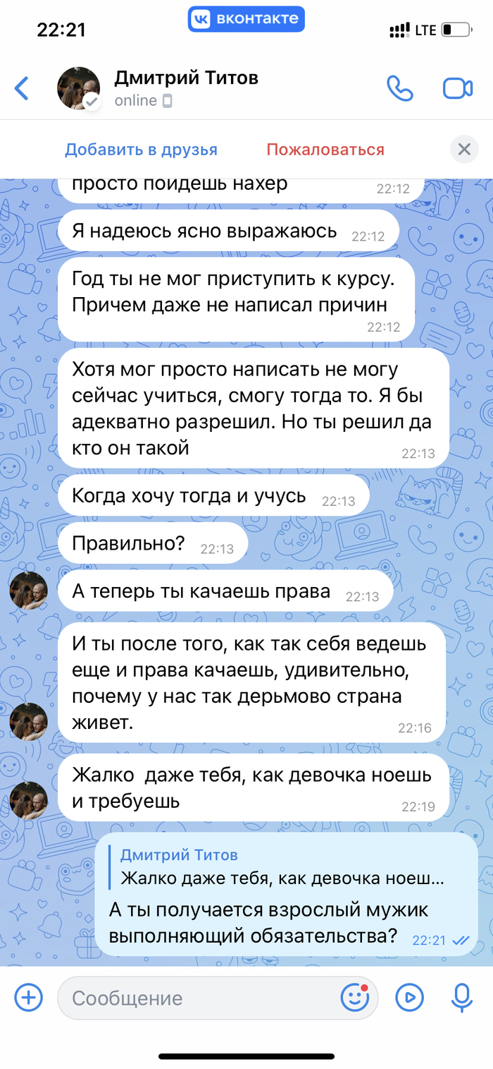 Вчера в его общий чат он опубликовал рекламу очередного обучения. Я спросил, а когда остальные закончатся? Как итог, он опять перевёл общение в личку, начал переходить на личности, оскорблять, заблокировал в группе ВК и на платформе с уроками.