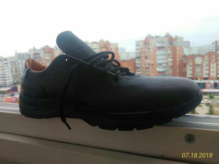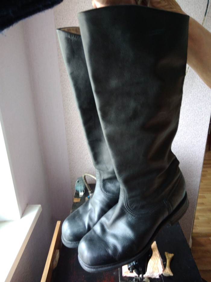 Эти сапоги дед сшил себе в 1996 г. Он планировал сделать их непромокаемыми, поэтому после изготовления он устроил им тест: налил воды по голенища, повесил над ванной и наблюдал, когда и откуда потечёт вода. Не потекла :) Рассказывает, что сушил их потом неделю :) Носит их до настоящего времени, осенью и весной, когда на улице сыро. Отличительная особенность - кожаная подошва и каблуки, только в самом низу тонкая резина (чтоб не скользили).