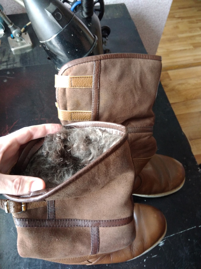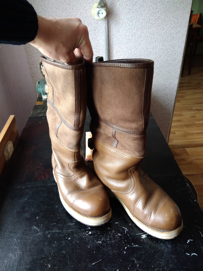 Сшиты им примерно в то же время, носит в сильные морозы. Кожа и мех - настоящие, подошва - фетр.