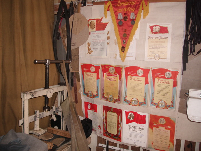 На фото рабочий беспорядок, дедовы награды (не все), висящие на стене лекала и сам пресс.