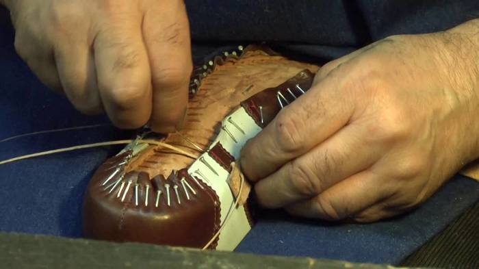 Этот надрез делается для того, чтобы, помимо приклеивания, подошву дополнительно пришить. Дед для этого использовал шило с крючком и т.н. дрАтву. Это капроновая нить, натёртая варом (гудроном). Такой узел было невозможно развязать, так как нить становилась очень липкой. После того, как подошва пришивалась, этот надрез заклеивался.