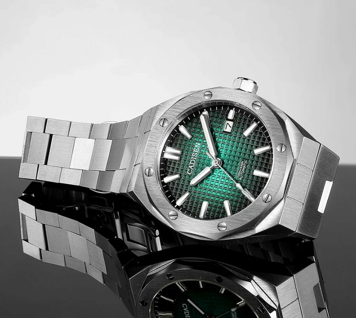 Корпус серебристого цвета, циферблат — насыщенный зелёный. Стекло — сапфировое. Модель выглядит сдержанно, но при этом заметна на руке.