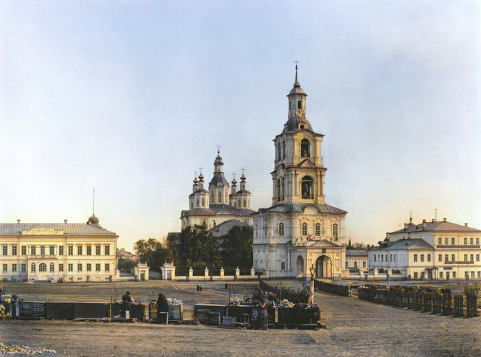 В центре снимка - Троицкий кафедральный собор Вятки (построен в 1760-72 гг., архитектор - князь Дмитрий Ухтомский, стиль барокко). В соборе хранилась главная святыня Вятской земли - Великорецкая икона святителя Николая. Собор и колокольня разрушены в 1930-е годы. Справа - здание духовной консистории (1746-52), ныне - жилой дом. Слева - дом служителей Троицкого собора (жилой дом, надстроен на два этажа). За ним виден шпиль колокольни старинного Богоявленского собора 17 века (снесен в 1930-е гг.).