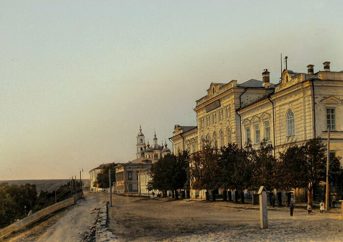Слева - флигель усадьбы, где в нач. ХХ века помещалась уездная земская управа, главный дом усадьбы стоит не по красной линии улицы, а в саду - в отдалении от проезжей части. Справа - здание окружного суда и его восточный флигель (западный здесь не виден). Позднее (в 1900 г.) флигели были перестроены и соединены с главным зданием. Далее - большой краснокирпичный дом на усадьбе купеческой семьи Сунцовых.