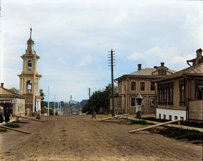 Царёвская улица на юг от перекрестка с ул. Московской Слева- колокольня Царево-Константиновской (Знаменской) церкви. Вдалеке - пожарная каланча второй части города.