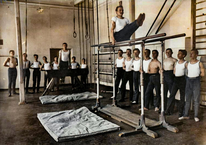 Гимнастический кружок "Вятские соколы". Занятие по гимнастике ведет преподаватель Ян Штангль (на брусьях).