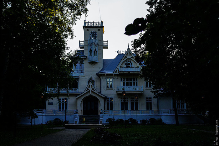 Отдельно я поехал посмотреть на дачу Башенина – это, как я понял, самый любимый и оберегаемый здесь архитектурный памятник. Идти внутрь было, конечно, уже поздно, так что я просто постоял у ворот и сфотографировал здание сквозь решётку.