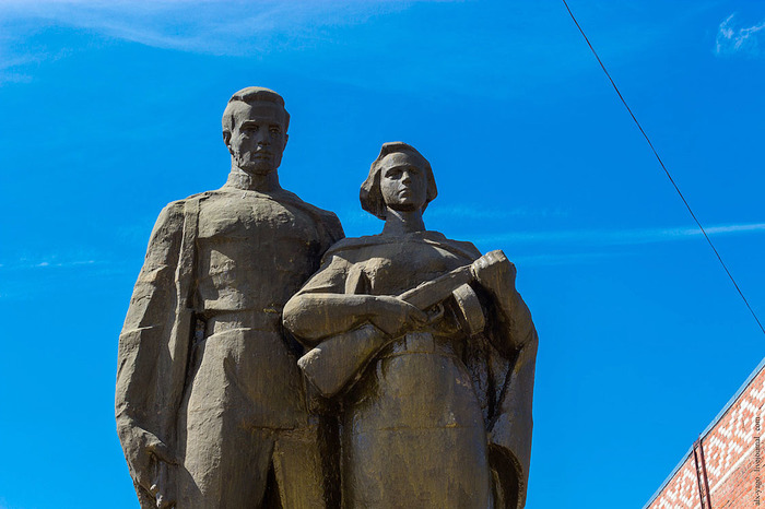 Для завтрака я свернул в деревеньку Ольхово. Там, кстати, стоит вот эта интересная скульптура, изображающая, как мужик провожает бабу на фронт: