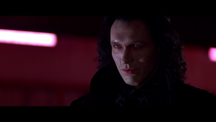 Конечно есть и неудачные моменты и откровенно глупые на мой вгляд, но я их заметил уже только тогда когда стал постарше. Например когда шаболды в мотеле, вместо того что бы вылетать от туда пулями из всех дверей и окон, толпись и верещали от ужаса, даже не пытаясь сбежать. Вампирская массовка не очень, я уже говорил что кровососы в этом кине, просто машины-убийцы. Они постоянно рычат, орут, корчат злобные рожи, но не прям всегда есть и хорошие моменты, когда от их вгляда действительно не по себе, как будто на тебя смотрит настоящий вампир. А главный злодей тоже получился каким-то плоским что ли. Выглядит устрашающе, но то ли актёр не очень, то ли он не понял кого играть. У Валека нет не харизмы, не вампирского злодейского обаяния, как у Дракулы Копполы или Дикона Фроста (мне так привычнее). Я повторюсь, если постоянно злобно гримасничать и орать демонстрируя длинные клыки это перестаёт быть страшным. Он больше кажется жутким в спокойном состоянии или когда говорит с Кроу в конце фильма. Если бы режиссёр проработал его получше, с такой-то внешностью, мог до сих пор быть в топе злодеев, по крайней мере того времени. Да и другим персонажам можно было бы уделить побольше времени, так вообще не понятно кто они и кем были до этого, лично мне это интересно, но этими вопросами не задаёшься при первом просмотре. Они возникают уже если смотришь во второй или третий раз, так как впервые фильм смотрится практически на одном дыхании..