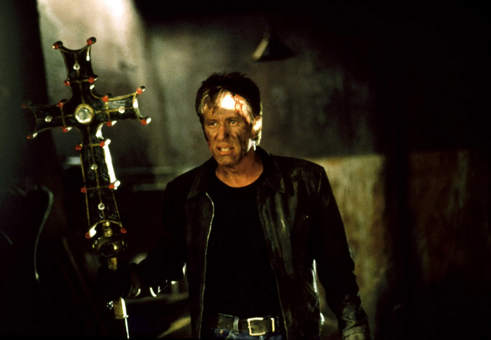 А вот главный вампир и антагонист проработан получше. И после того как команда Джека выпиливает всё его логово, Валека там не обнаружилось. Да, его зовут Ян Валек, вроде бы расовый чех, самый первый в своём роде, вампир я имею виду. Поступил не по понятиями и покинул гнездо во время зачистки, хотя не должен был, а может вообще его не было там на тот момент. Пока Кроу недоумевает где же главарь, его команда бухает в каком-то мотеле с блэкджэком и шлюхами. Валек заявляется уже тогда, когда все напились и выпиливает всю команду к хуям. Отпор в состоянии дать немногие, да и от тех толку мало. Пули навредить ему не способны, но видимо какую-то боль всё же причиняют, поэтому Валек решил прикрыться шлюхой. Ему помогло, девке не совсем, шаболду эпично нашпиговывают свинцом..