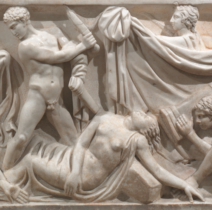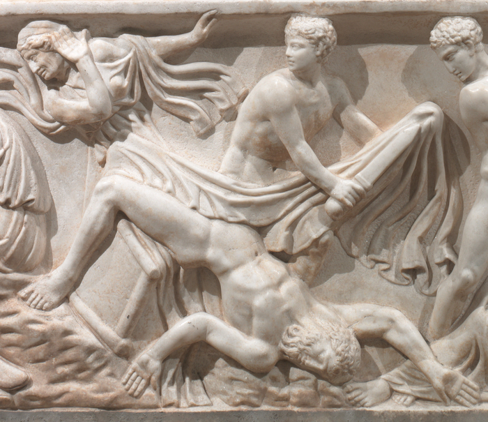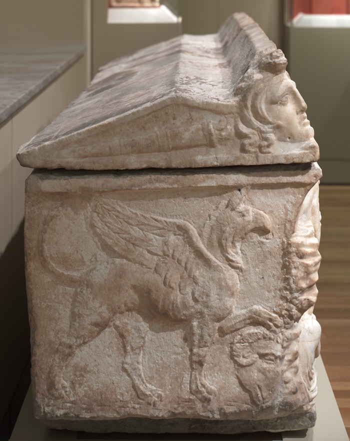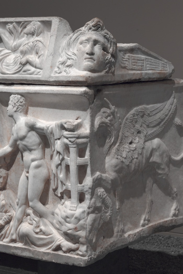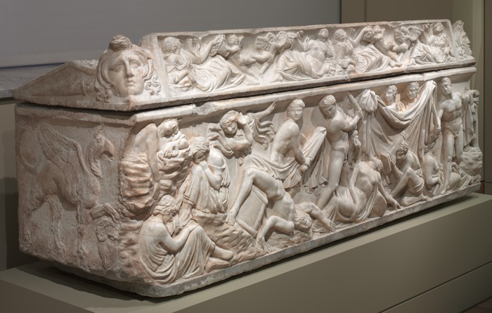 Этот римский саркофаг изготовлен в Риме из белого греческого мрамора и датируется 100-125 гг. нашей эры. На саркофаге изображены сцены из греческой мифологии, рассказывающие об Оресте.