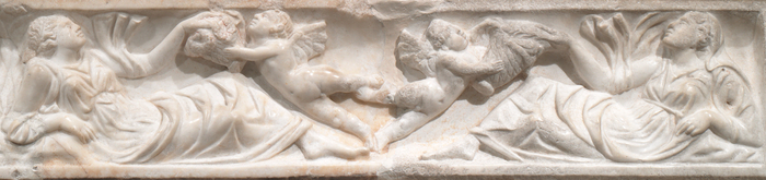 На крышке саркофага четыре лежащие женщины символизируют времена года, расположенные в порядке справа налево: зима, весна, лето, осень, на что указывает их одежда и содержимое их корзин.