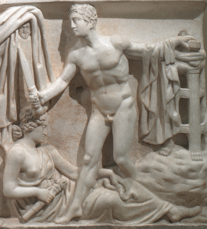 В центре он стоит над телом своей матери Клитемнестры, а слева над телом её возлюбленного Эгисфа. Орест убил их обоих, чтобы отомстить за убийство своего отца Агамемнона после его возвращения после многолетней борьбы под Троей.