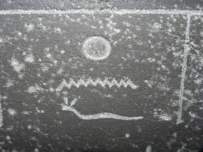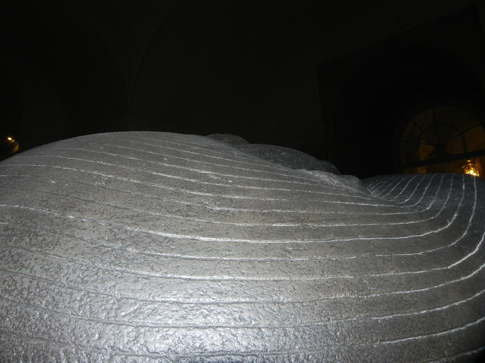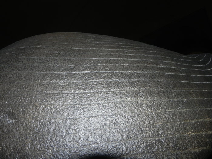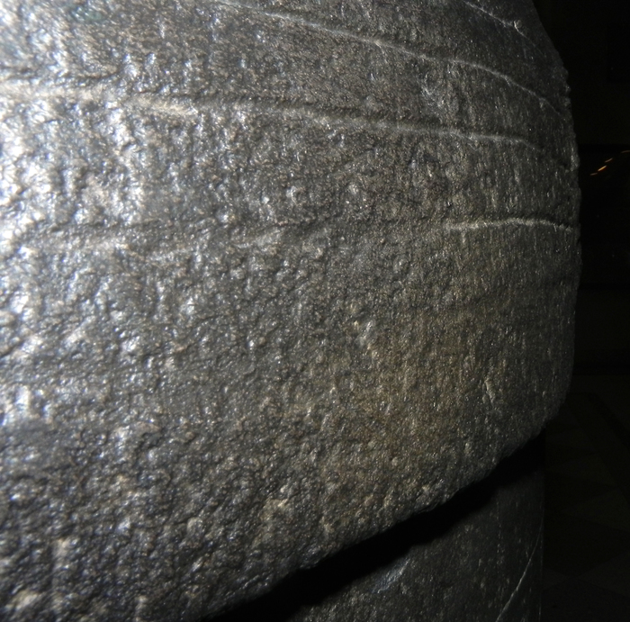 На этом фото видно, что полоски не имеют следов ярко выраженных точечных ударов инструмента, и выглядят так же как поверхность между ними, за тем лишь исключением, что внутри полосок "бугристость" помельче. Я бы очень хотел посмотреть как такое можно сделать железным долотом, или маленьким долеритовым шариком.