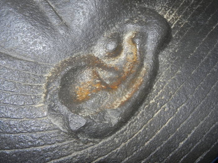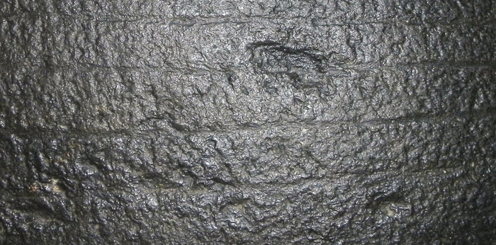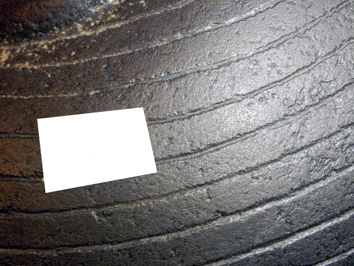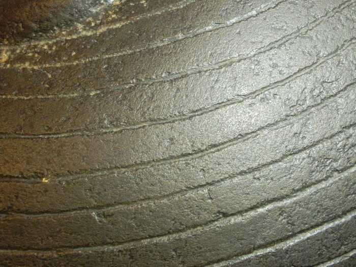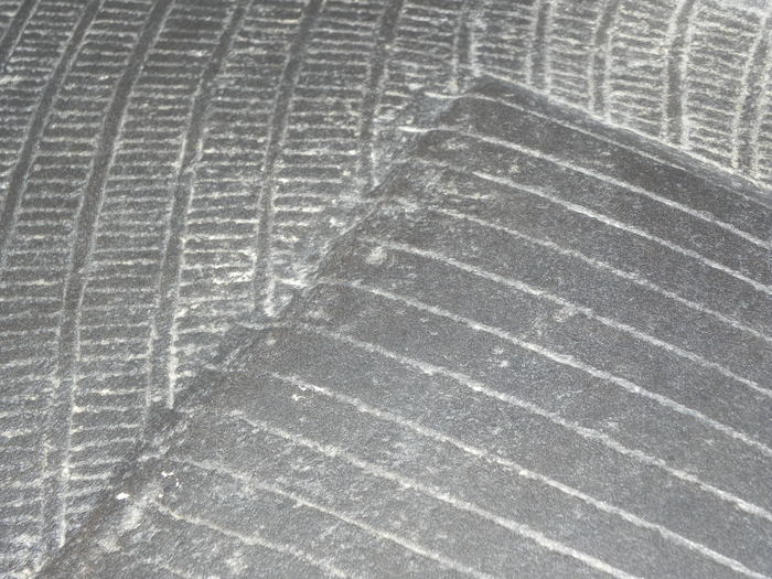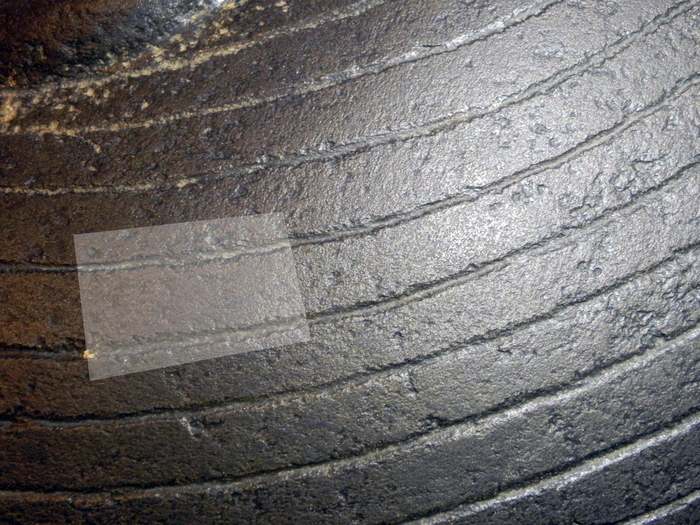 Прекрасно видно, что концы линий, часть которых я закрыл, совершенно не стыкуются между собой. Слева они устремляются в горизонт, а справа наоборот загибаются слегка вверх. И что характерно, качество выполнения самих линий не вызывает никаких вопросов, что слева от закрытого участка, что справа - дно ровное, линии глубокие, и поверхность между ними обработана достаточно хорошо.
