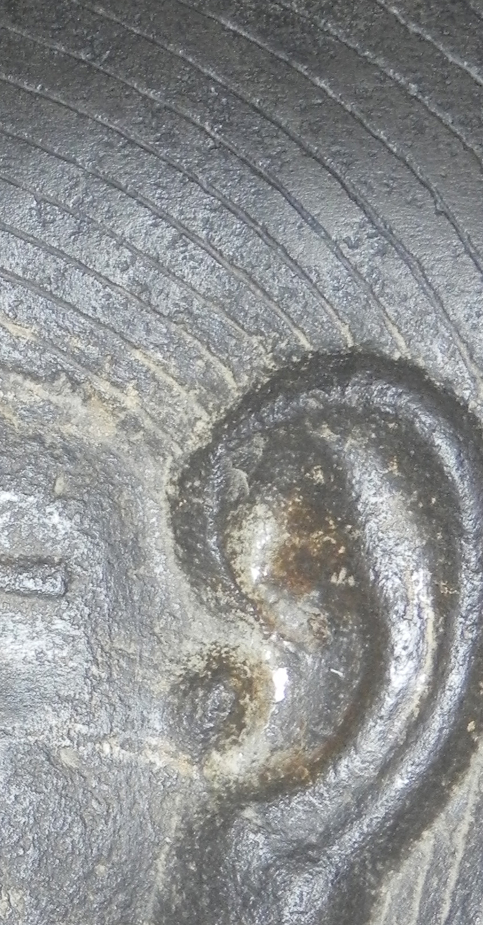Прекрасно видно, как разрушения по верхней кромке уха согласуются с приходящими линиями рисунка парика.