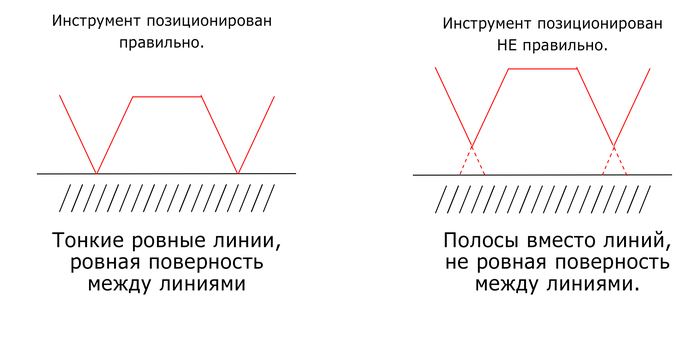 Предположим (!) что такой инструмент существует, тогда в точке фокусировки мы будем иметь максимальную эффективность и точность, и будем получать ровные и глубокие линии, в случае если же, если точка фокусировки будет выше чем нужно, то эффективность работы инструмента будет падать в зависимости от того, как высоко точка будет находится. И соотвественно, вместо ровных и глубоких линий, мы будем получать неглубокие полосы, и "рваную" поверхность между ними. Естественно, чем выше мы поднимаем точку фокусировки относительно обрабатываемой поверхности, тем более незаметнее будет эффект от применения инструмента.
