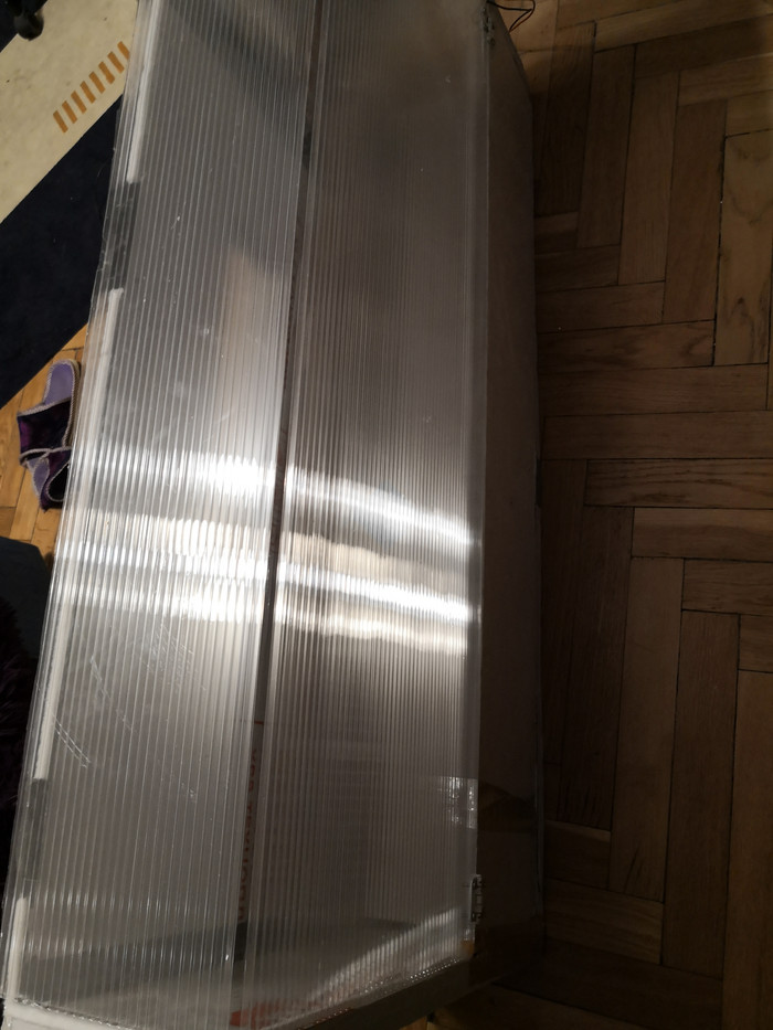 В следующем году я решил пойти "от противного" и отправить растения на балкон, обеспечив им нагрев. Основа - тот же технониколь, но если на окне свет пропускало само стекло окна, тут в качестве светопропускающего но теплоизолирующего материала я взял сотовый поликарбонат - материал, из которого делают теплицы. Греющий элемент - инфракрасный тёплый пол. Греет предметы на которые направлен, сам даже при комнатной температуре не прогревается выше 50 градусов, производительность падает при нагреве из-за повышения сопротивления. И вы знаете? Это сработало!