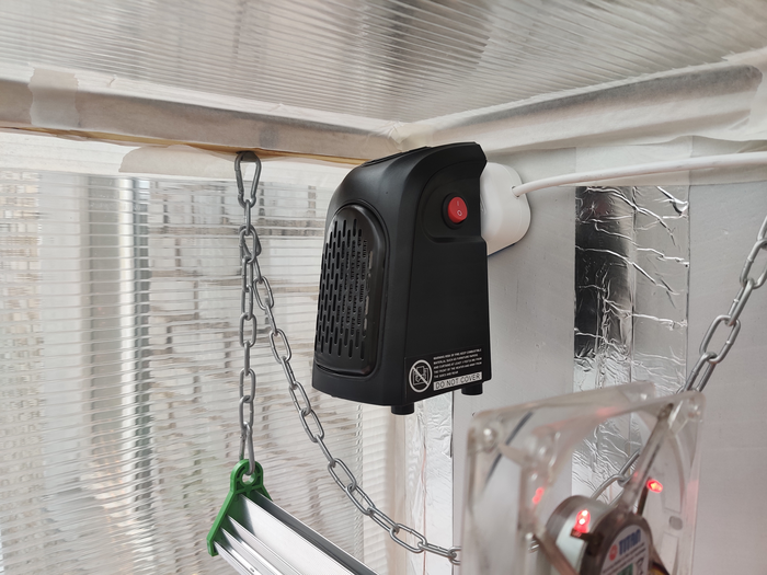 В таком объёме теплички (почти полкубометра) тёплый пол уже не слишком справлялся поэтому в помощь ему был подключён 400-ваттный обогреватель. Дует на ура, хотя при +3 он думает до минуты прежде чем таки стартануть - холодно ему)) Управляет всё та же Zigbee розетка.