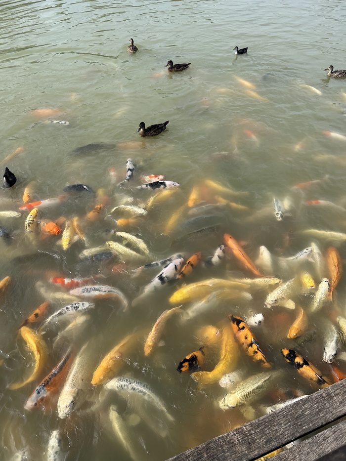 Ах да, пруд с рыбами. Возле него расположен стеллаж, с бесплатным кормом для жителей водоема. Любой турист мог взять и свободно кидать в воду. Поэтому все, кто там обитали, быстро нашли взаимосвязь, между приближением человека и набиванием желудка. И как только очередные туристы подходили к берегу, вода начинала бурлить, а сотни золотистых карпов бились с утками за внимание «спонсоров». На моих такс, не особо умные водоплавающие, реагировали так же, чем сводили с ума Боню