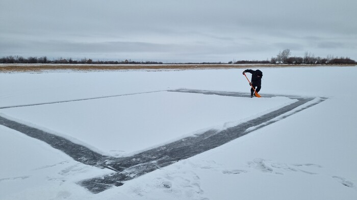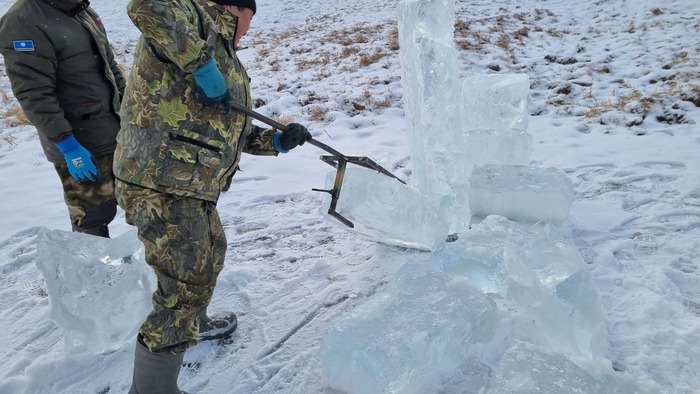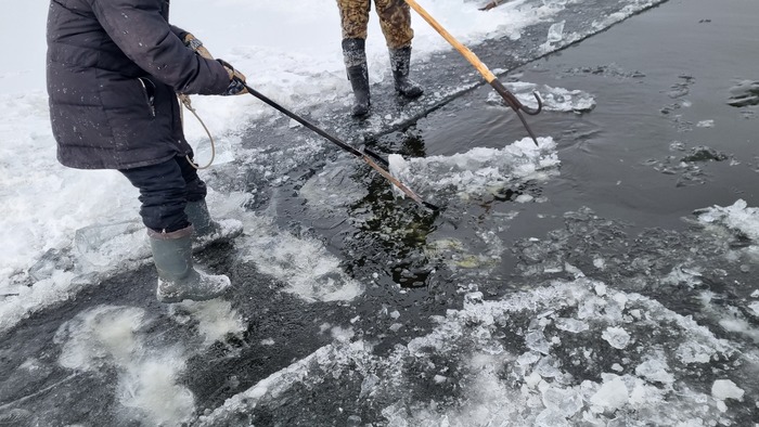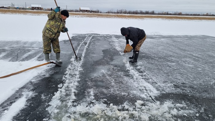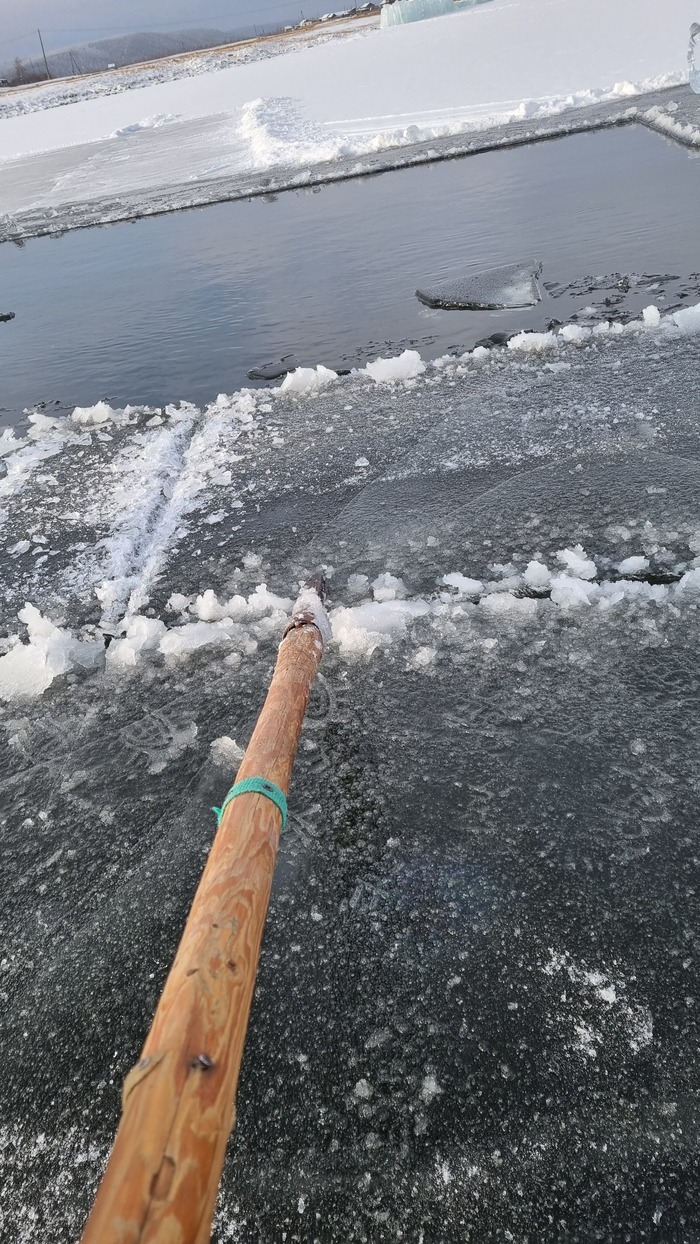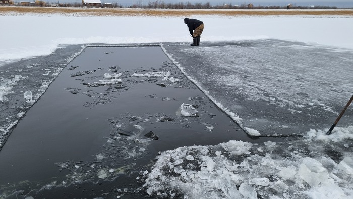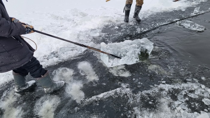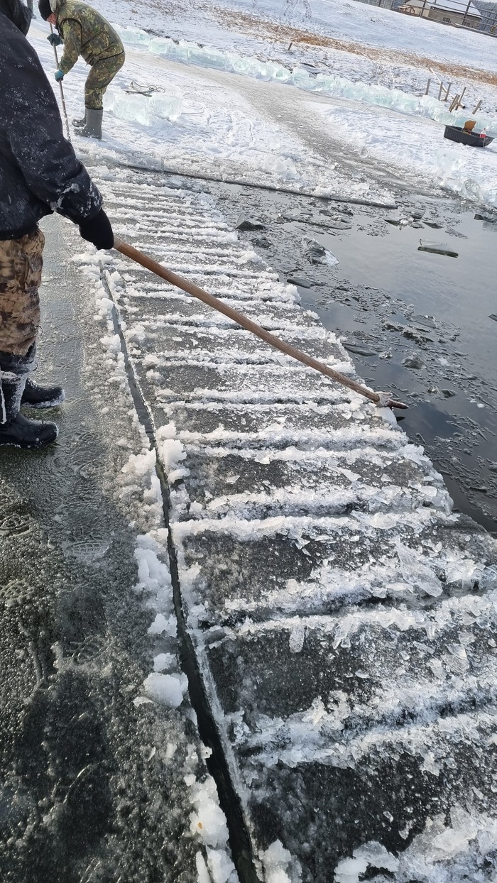 Все разрезано, начинаем доставать лёд. В этом году отец смастерил щипцы, раньше доставали при помощи того же Анньыы и чьей то матери. На месте оператора по "вытаскиванию льда при помощи щипцов" царапаем несколько упоров под ногами и пологий трамплинчик чтоб лёд доставался легче.