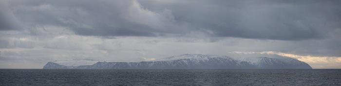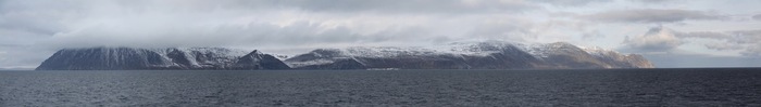 12 октября. Утро. Прошли мыс Дежнёва. Начался Северный Морской Путь. Не знаю, может, кто это начало и заметил, но у меня тока пара панорам интересных получилась. А так — как шли так и идём. Лишь вода забортная стабильно держится ниже нуля по Цельсию.