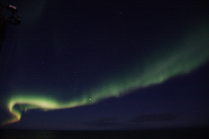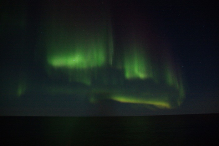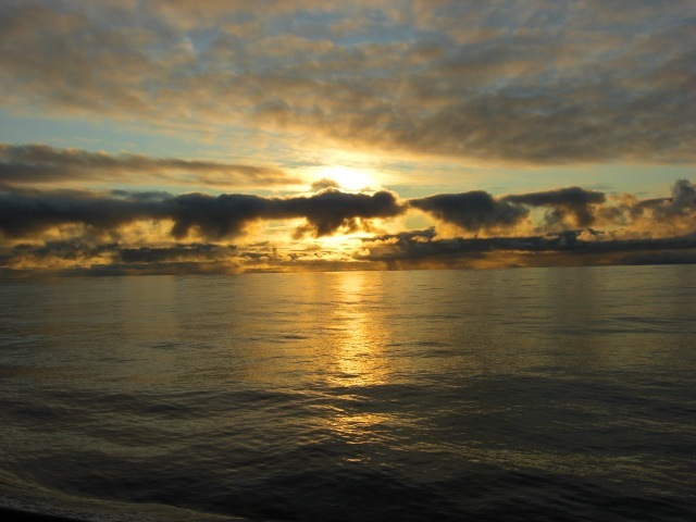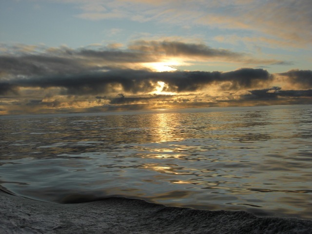 13 октября. За бортом вода минус 2.4 — 3 Цельсия. Непривычно. Солнце окрашивает красно-золотым цветом лишь верхушки высоких волн. И то — пару-тройку часов в сутки. В 3 часа по полудни уже темно. КАК люди живут в этих широтах?