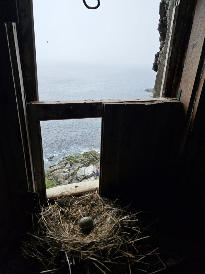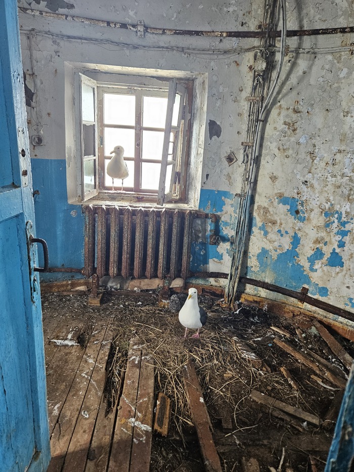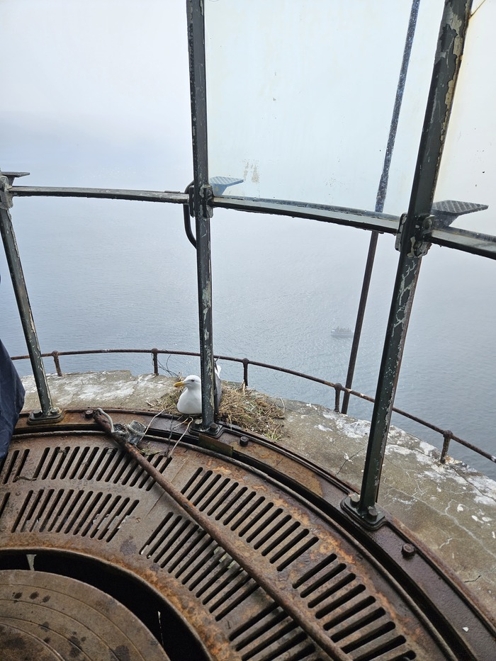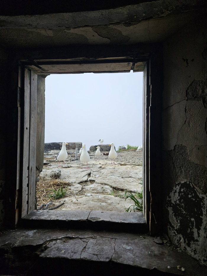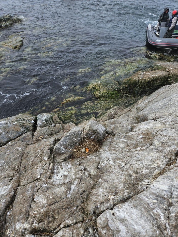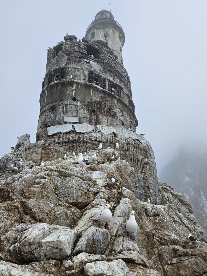 Высадились на маяк. Некоторые остались в лодке. Куча чаек и их гнезд.
