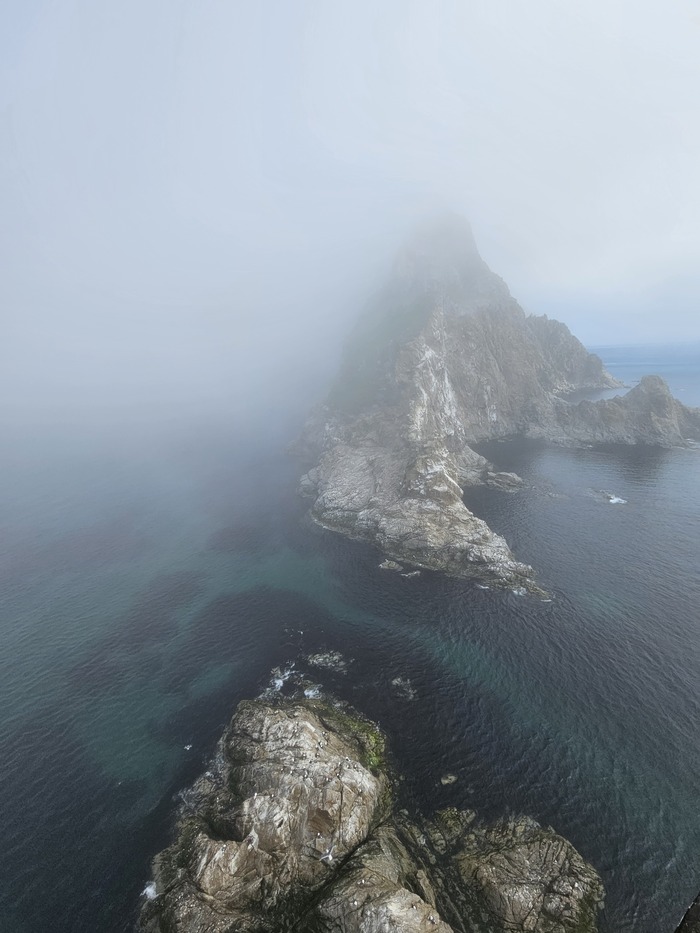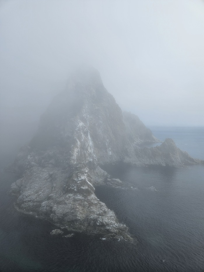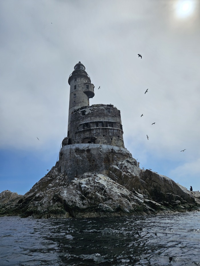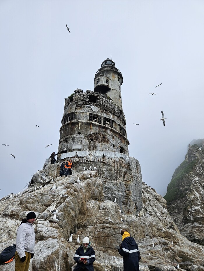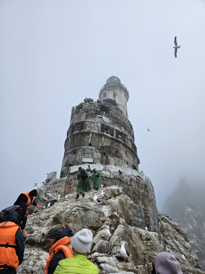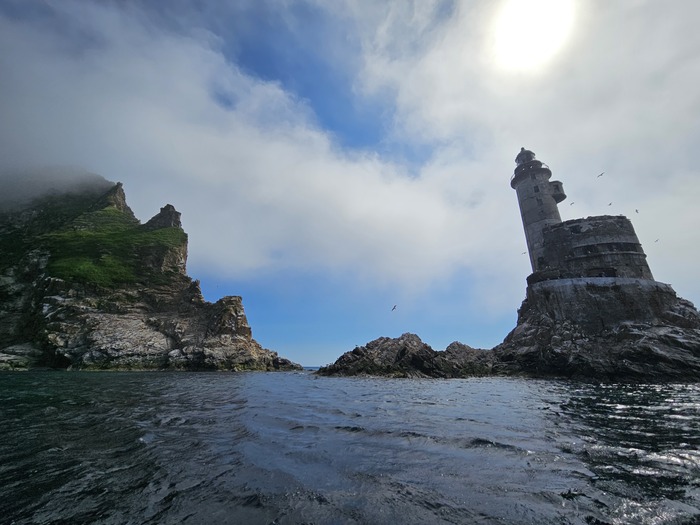 Видели в далеке касатку, ещё буревестники соревновались с лодками в скорости. Шли по морю где то час. Потом в тумане показался маяк, возле него на нас из воды смотрели любопытные нерпы