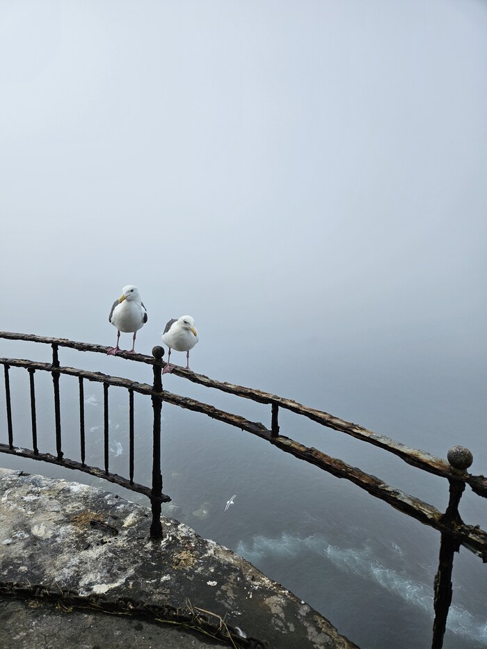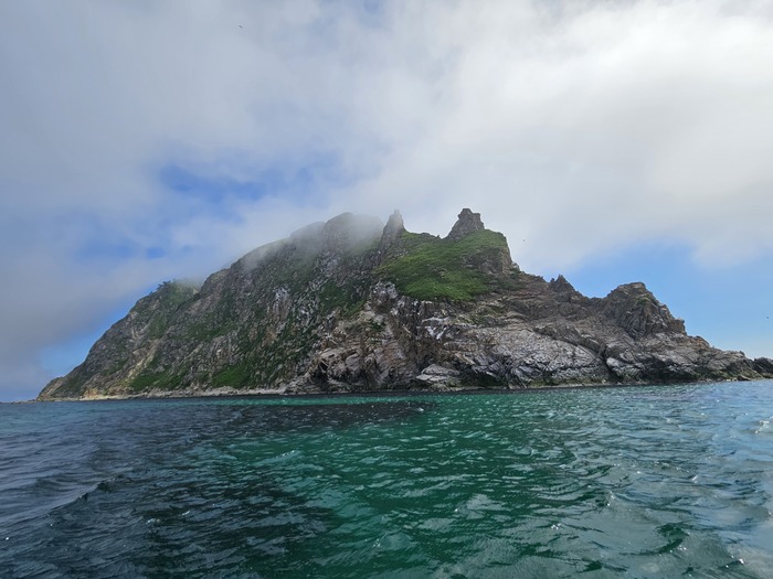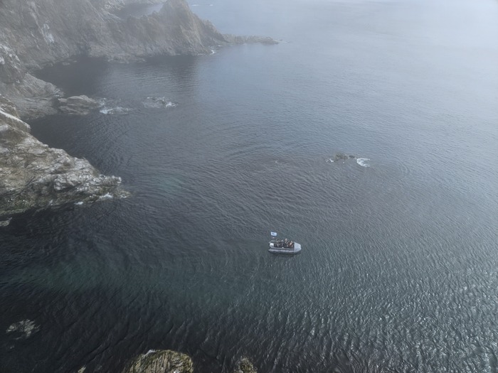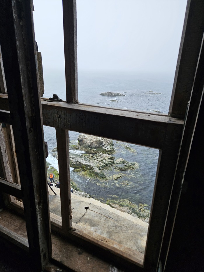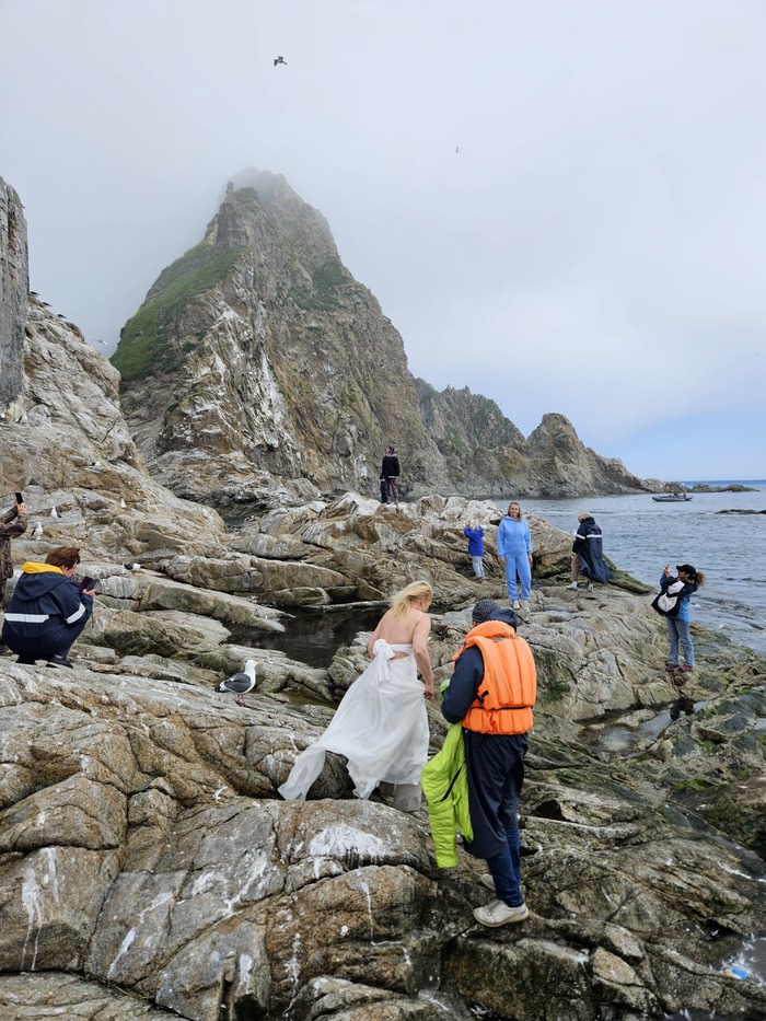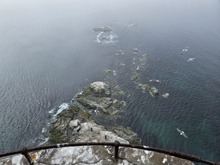 Видели в далеке касатку, ещё буревестники соревновались с лодками в скорости. Шли по морю где то час. Потом в тумане показался маяк, возле него на нас из воды смотрели любопытные нерпы