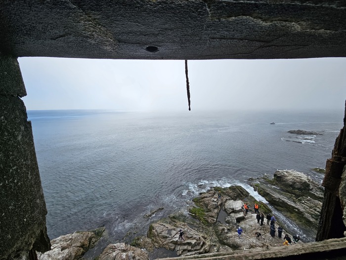 Наверх надо взбираться по верёвке. Бабки и тётки тормозят, делают это медленно. Чайки кусают и срут на них охраняя свои яйца и птенцов