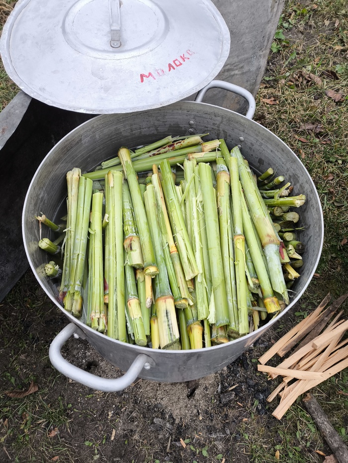 З@ебался я чистить стебли и рубить на куски, но в деревне негра ни одного нет, пришлось самому. Только кот помогал вываривать. Было с тростника много какой-то клейковины, на сопли очень похоже. Тростник реально сахарный, нутро сладкое, на вкус напоминало компот из сухофруктов. Вываривал долго, прям надоело. Но и ошибок наделал много: срубленный тростник скисает за 2 дня, надо вываривать сразу. Вообще вываривать - муторно, надо сажать много и делать через пресс, чтобы давить сок. выварил все примерно до 25 литров, сладости было очень мало. Поэтому из рома у меня получился самогон на основе тростника. Пришлось добавлять сахар и дрожжи.