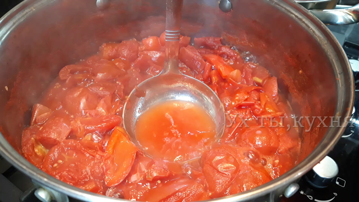 4. В кастрюлю налить 100 мл воды, положить помидоры, перец сладкий и острый, чеснок и довести до кипения на среднем огне при закрытой крышке, время от времени перемешивая. Как только выделится сок огонь убавить до слабого и варить 1 час при полуоткрытой крышке, чтобы выпарился лишний сок.