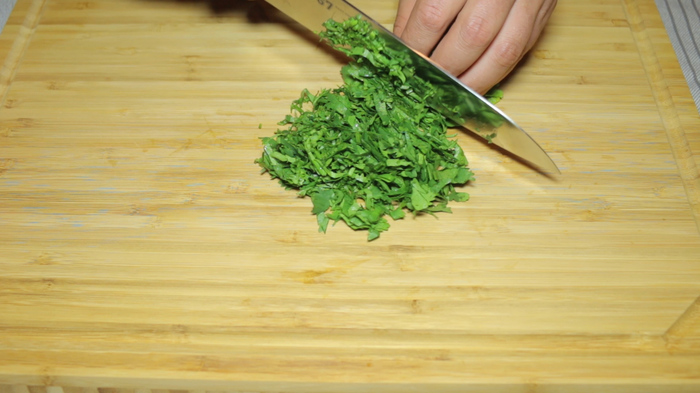 Берем 2 небольших пучка кинзы (примерно 50 грамм) и мелко нарезаем их прямо со стеблями. В стеблях, кстати, содержится наибольшее количество витаминов, и выкидывать их не стоит ни в коем случае.