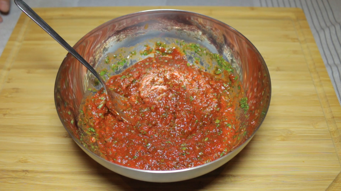 4) Пестиком или ложкой (пальцы использовать не советую - будет жечь) перетереть массу в мисочке. В этот момент вы почувствуете прекрасные ароматы будущего соуса во всей красе.