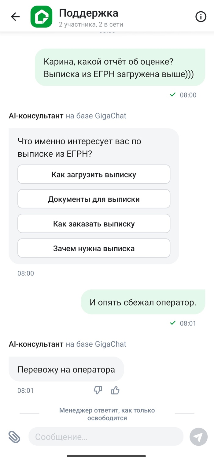 И тут на сцену выходит новый герой - оператор Карина. Надежда снова теплится! Карина, видимо, ознакомилась с историей моего диалога (шучу, конечно, никто там ничего не читает) и выдает: "Документы по страховке и отчётом по оценке мы видим, ожидаем загрузки остальных". Страховке? Какой блин страховке? @Sber,У нас тут пропала выписка из Росреестра. Такое чувство, что ваши операторы поддержки и НЕЧТО, которое генерит названия для продуктов икеи, сидят в одном кабинете.