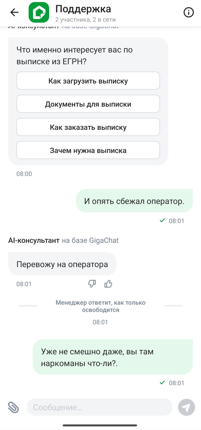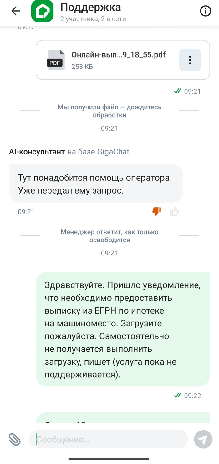Сомнительно, но окей. Ведь есть же чат поддержки. Открываю этот самый чат, загружаю туда PDF с выпиской ЕГРН. И пишу, мол так и так, пришло уведомление, просьба загрузить, та как у личного кабинета лапки.